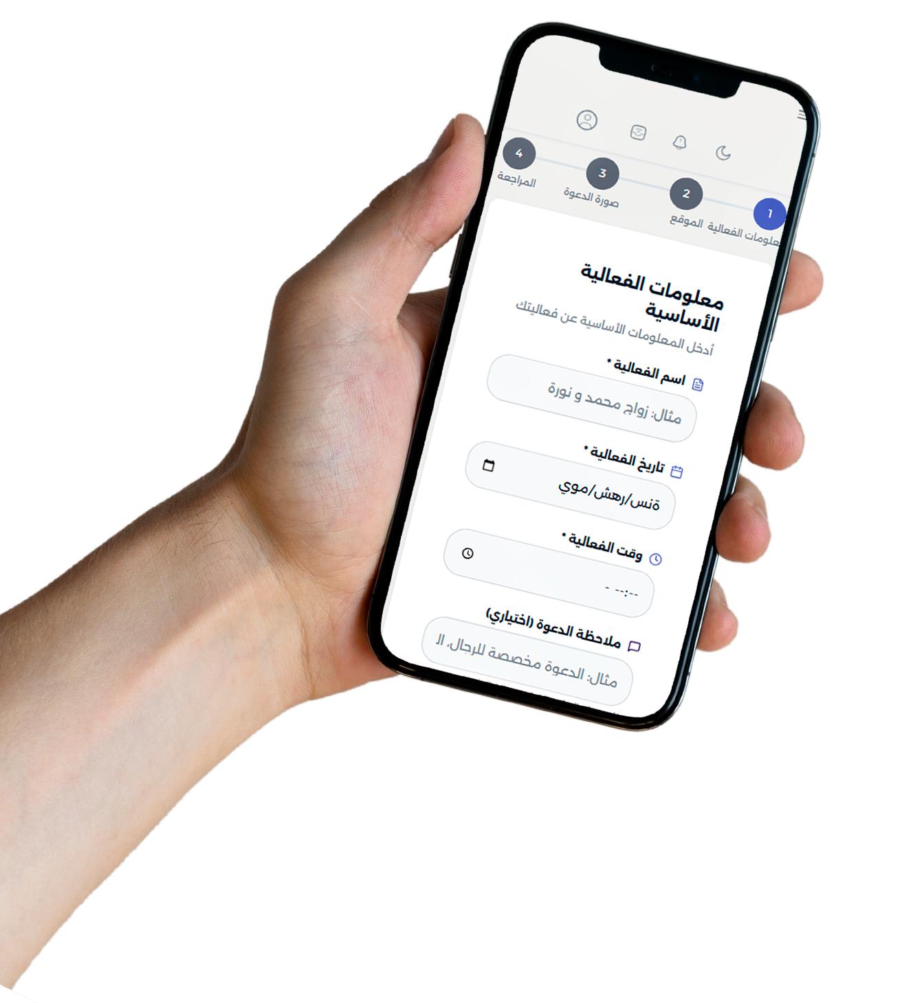 أدخل تفاصيل الفعالية: الاسم، التاريخ، الوقت، الموقع، والوصف